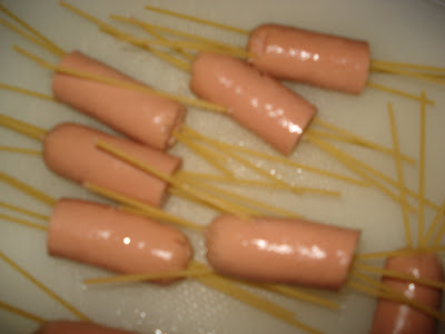 Cortei as salsichas o meio e, com cuidado, espetei-lhes o esparguete cru. Espetei cerca de 3 a 4 fios de massa por cada metade.