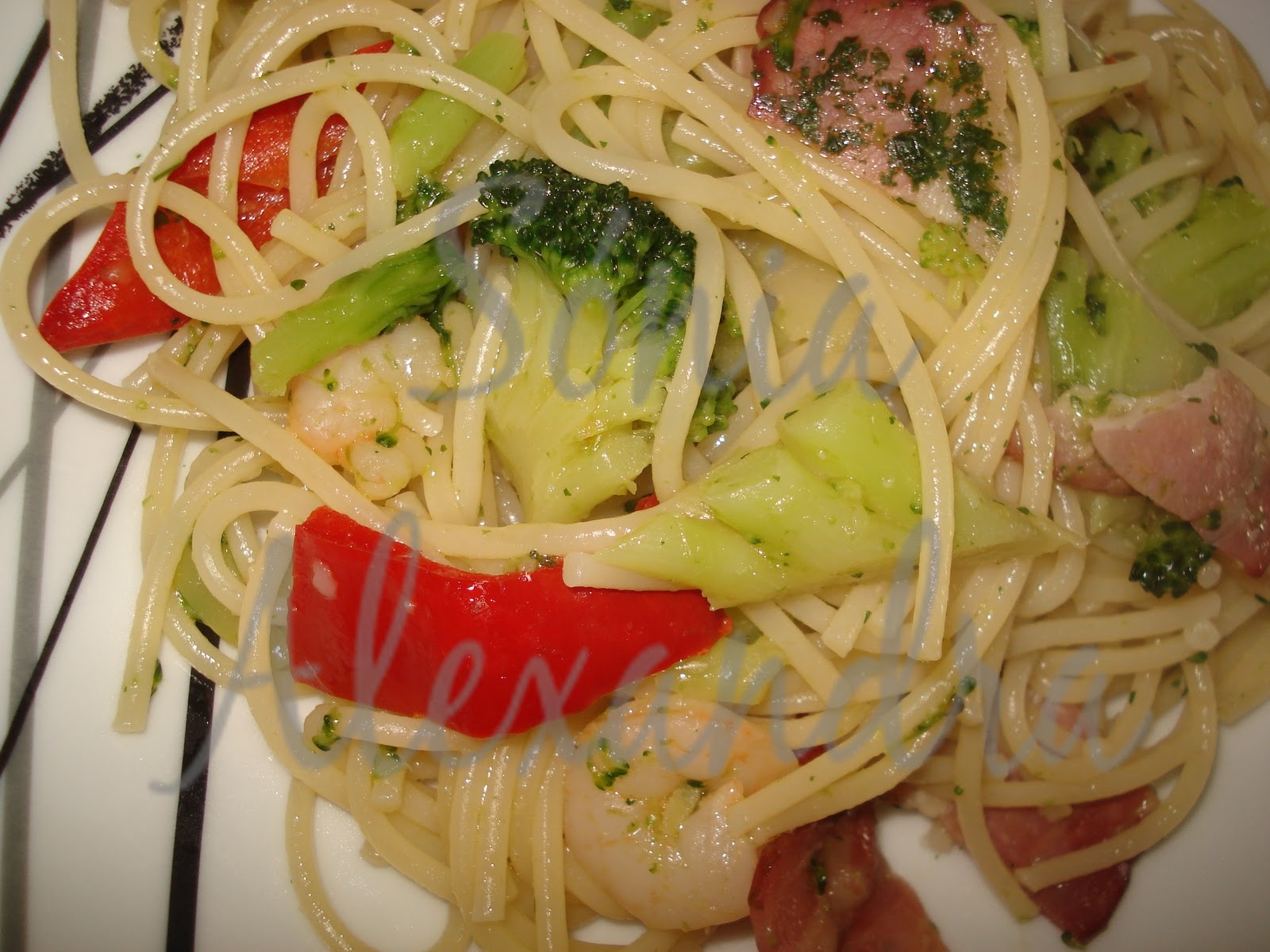 Cozi o esparguete al dente. Reservei. Numa frigideira antiaderente coloquei o alho em pó e o azeite. Deitei o bacon cortado em pedaços, os bróculos cozidos, o miolo de camarão e o pimento. Temperei com o 1/4 do caldo de galinha. Deixei saltear.