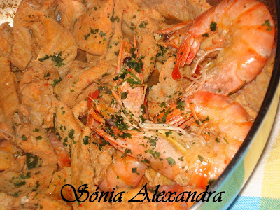Coloquei numa frigideira antiaderente um pouco de azeite e cozinhei as febras, lentamente. Acrescentei os cogumelos e deixei cozinhar bem.