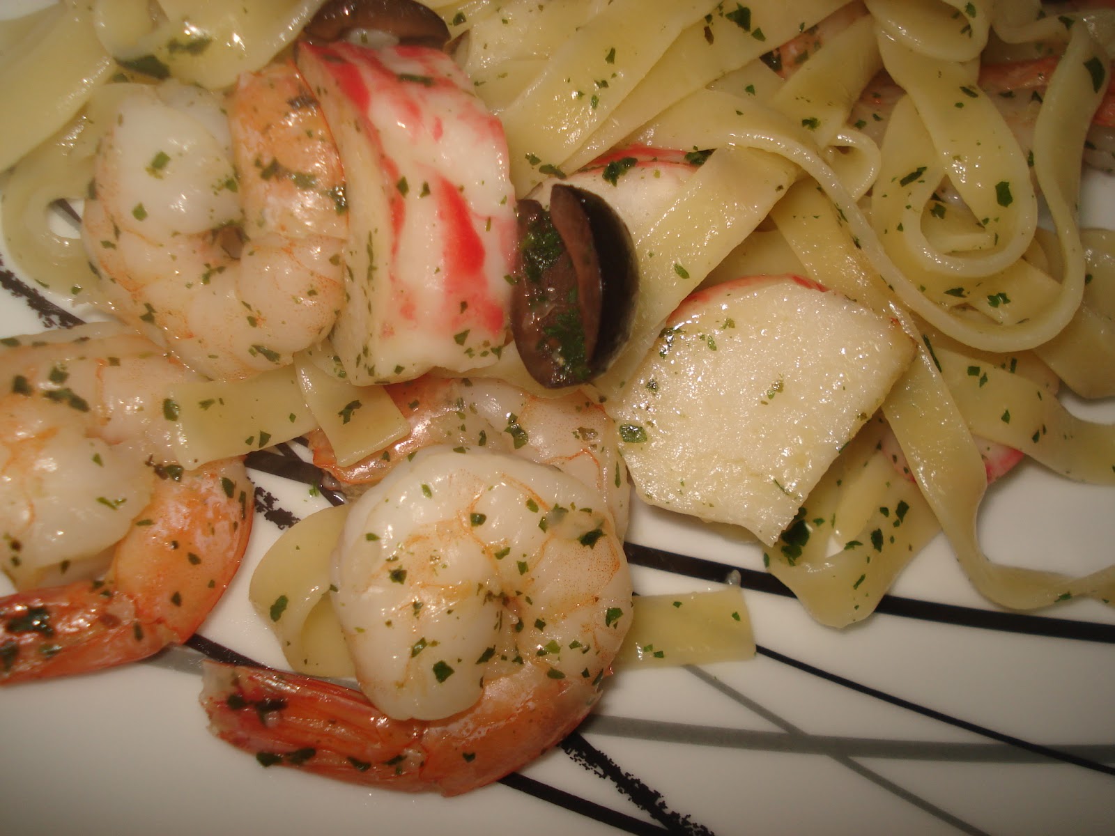 um pacote de tortellinis frescos. Um resto de delicias do mar, e meio pacote de miolo de camarão.