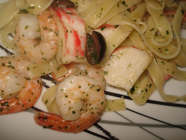 Cozi os tortelinnis e reservei. Coloquei o alho picado numa frigideira, com o miolo de camarão e as delicias. Salteei. Acrescentei os tortelinnis, e deixei cozinhar mais um pouco.